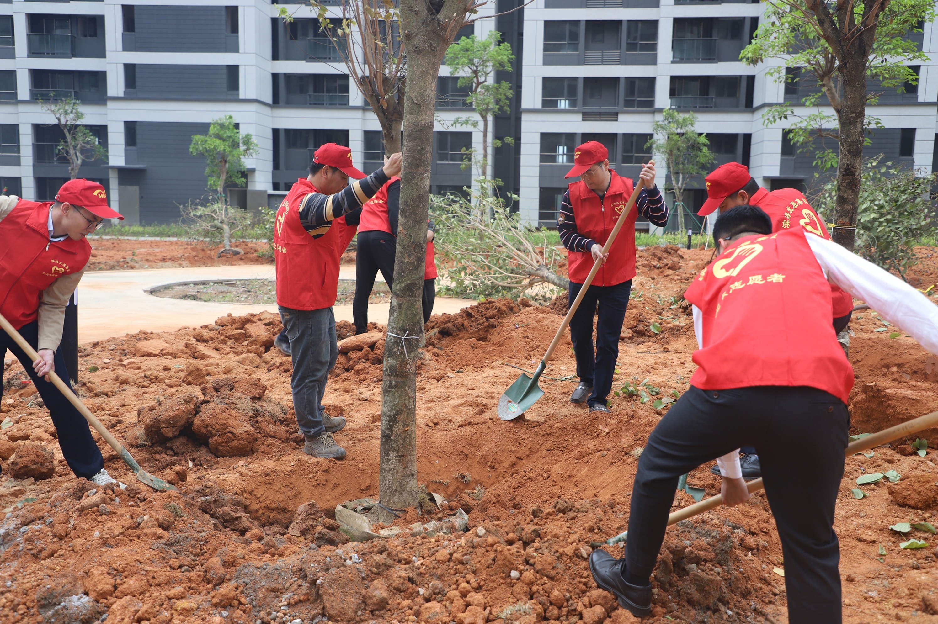 活動現場一片熱鬧,集團領導班子率先垂范,黨員干部職工熱情高漲。受集團黨委書記、董事長呂崇君的委托,在集團黨委委員、總裁李滔的帶領下,眾人分工協作,揮鍬鏟土、扶苗培根、圍堰澆水,經過一個多小時齊心奮戰,40棵宮粉紫荊樹在東灣綠城迎風而立,與周邊的建筑物相映成趣,形成一道亮麗的風景線。